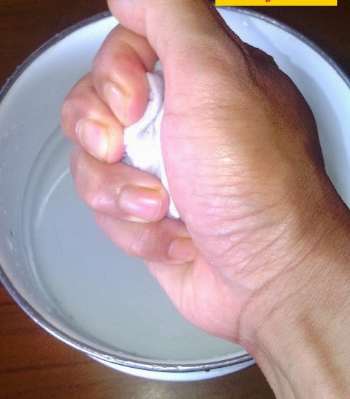 Caranya, siapkan sehelai kain halus (bahan kaos) atau saputangan lembut. Basahi kain tersebut dengan cara dicelupkan ke dalam air. Pastikan air tersebut bebas kaporit, atau gunakan saja air sumur atau air minum mineral atau air RO.